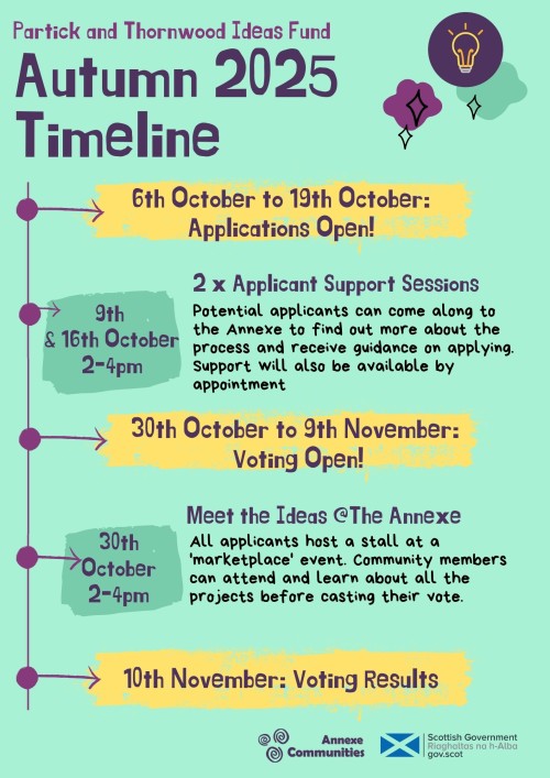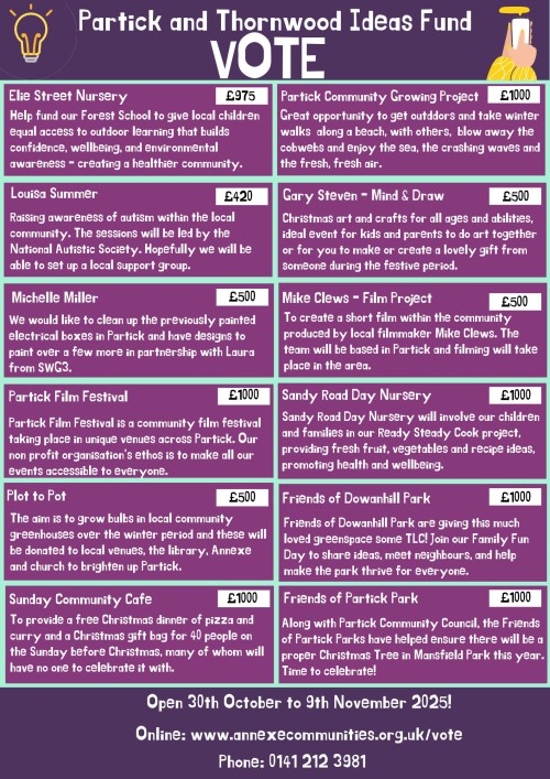 Residents (individuals or groups) can apply to fund an idea that will benefit the local area and grants range from £150 to £1,000. Ideas are limitless but must benefit the local community. And in turn residents can cast three votes for their favourite ideas. A steering group led by Annexe Communities was formed in 2020 consisting of representatives of community councils, local churches, residents and Partick Housing Association. The group decides on the format and process of each round of funds – ensuring applications are accessible to all who are eligible. Successful applicants can hold one award per financial year (April to March).